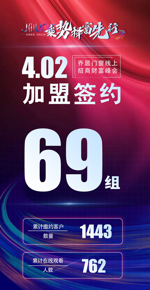 2023年4月2日,乔居门窗成功举办首届线上招商财富论坛,以“乘势 择富 先行”为主题,吸引了全国各地千余名建材家居经销企业参与。在这场招商会上,乔居展现了卓越的品牌实力和产品魅力,一举拿下69组签约加盟,共同与各经销商探讨财富增长的路径,共筑美好未来。